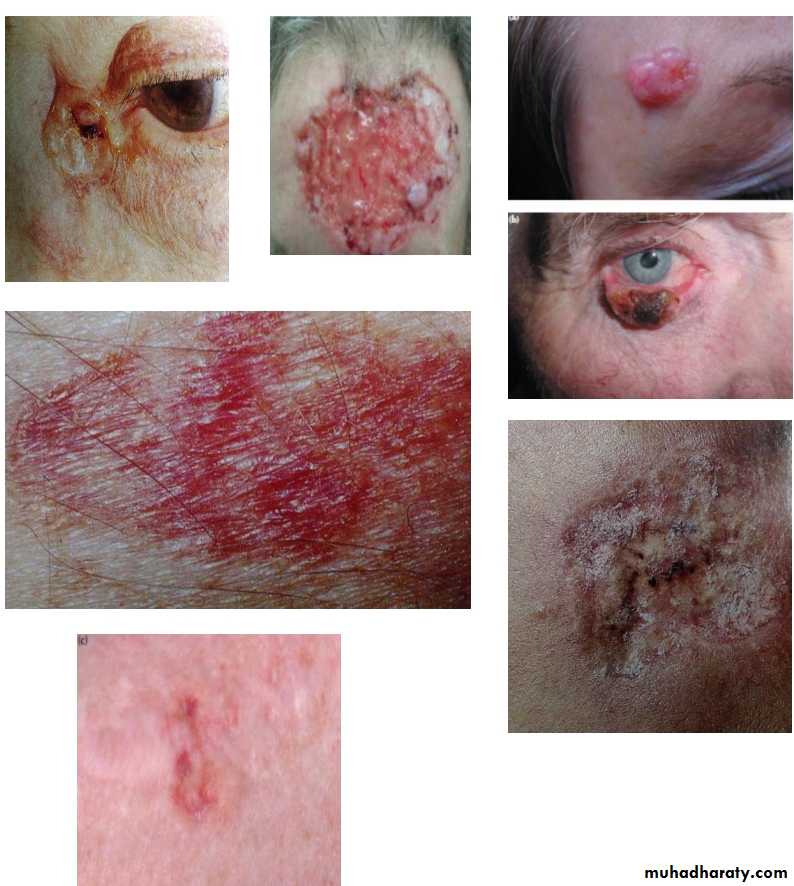 Risk factors : 1- Sun exposure. 2- Adancing age. 3- Faint complexion. 4- Long term exposure to psoralene and UVA therapy (for psoriasis). 5- Arsenic exposure. 6- Immunedefeciency. 7- Radiation 8- Viral infection e.g. HPv 16,HIV.Type of basal cell carcinoma : 1- Nodular ulcerative type. 2- Superfscail spreading. 3- Sclerosing type. 4- Pigmented type. 5- Basal cell naevoid syndrome (Gorlin syndrome).