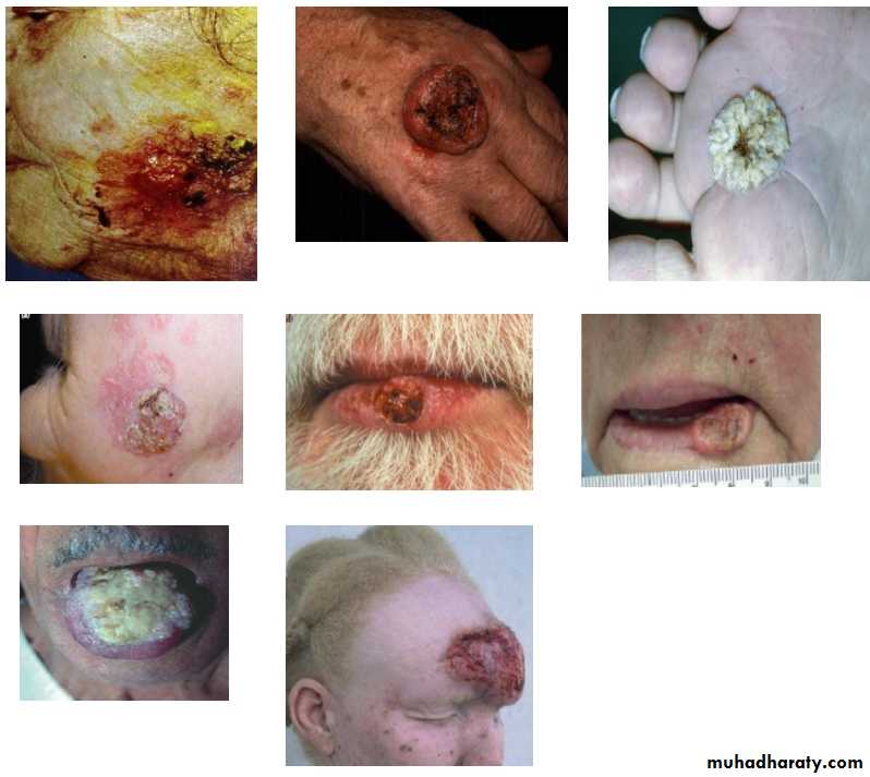 Sequamous cell carcinoma : It originates from the keratinising cells of epidermis or its appendages. it also arise from stratum basale of epidermis but, unlike BCC,it expresses cytokeratins I and 10. Types of sequmaous cell carcinoma: A-verrucous SCC: slow growing,exophytic,and less likely to metastasize. B-ulcerative SCC:grow rapidly and is locally invasive. Microscopic appearances :Charactrestic irregular masses of squamous epithelium are noted to proliferate and invade the dermis from the germinal layer.this tumor is stains positive for cytokeratin 1 and 10.