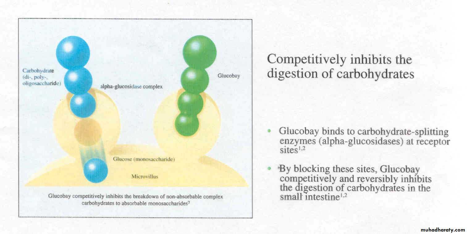 Mechanism of action• Inhibits intestinal alpha-glucosidases and