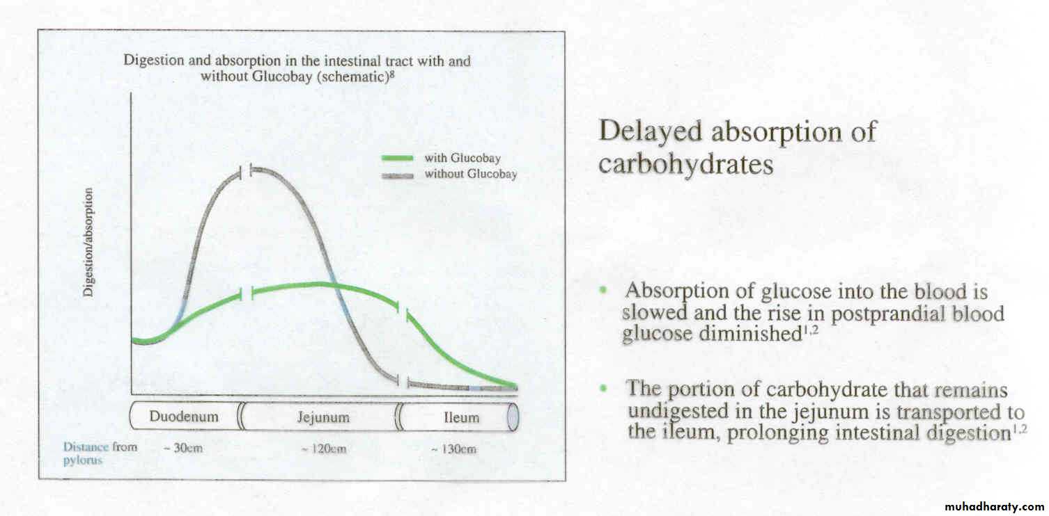 • delays carbohydrate absorption, reducing postprandial increase in blood glucose