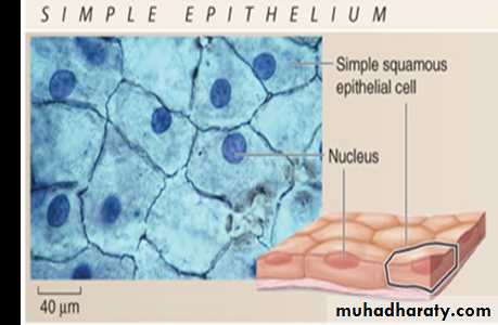 1-Simple squamous epitheliumConsists of a single layer of thin, flattened cells that fit tightly together and have flattened nuclei. It is found where filtration is needed (kidneys, lungs) .