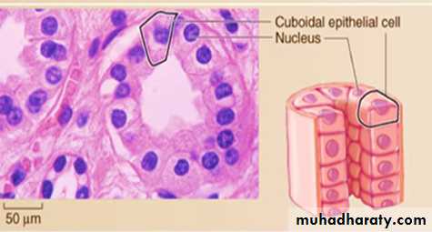 • Consists of a single layer of cube-shaped cells that usually have centrally located, spherical nuclei.• Functions include secretion and absorption (located in small ducts of glands and kidney tubules).