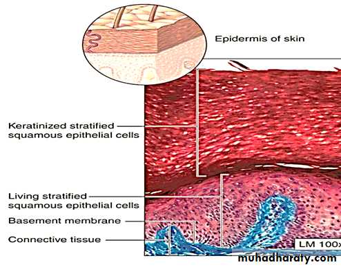 It is similar to stratified squamous (None keratinized) Epithelium except that the superficial layers are composed of dead cells whose nuclei and cytoplasm have been replaced with keratin, a tough layer that resists friction and is impermeable to water. This epithelium constitutes the epidermis of skin.6-Stratified cuboidal epithelium