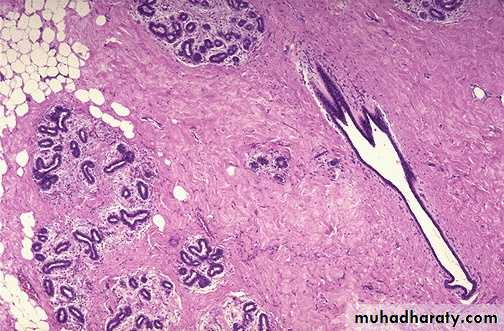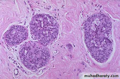 There is a larger duct to the right and lobules(TDLUs) to the left. A collagenous stroma extends between the structures. A variable amount of adipose tissue can be admixed with these elements.Apart from a keratinizing squamous lining close to the nipple, the ducts and ductules are lined by a two-layered epithelium, an inner layer of cuboidal or columnar cells and an outer discontinuous layer of smaller, contractile myoepithelial cells.