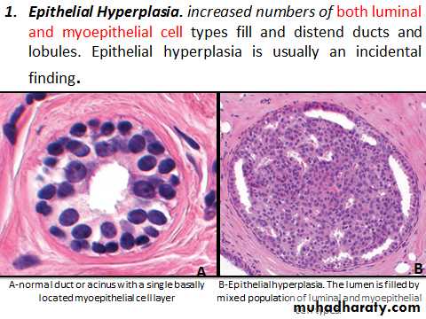 Lesions characterized by proliferation of epithelial cells, without atypia, are associated with a small increase in the risk of subsequent carcinoma in either breast.Epithelial hyperplasia