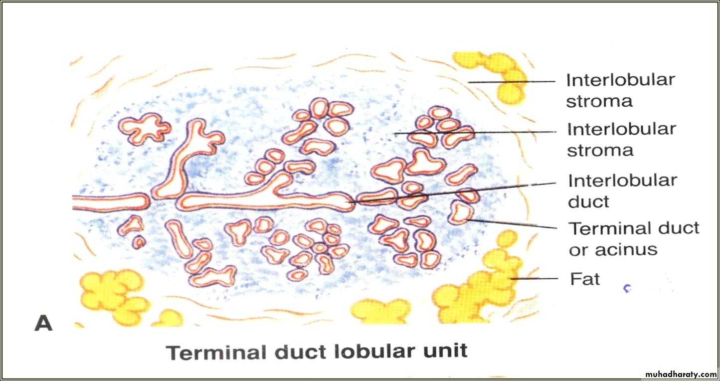 Successive branching of this large ducts eventually leads to the terminal duct lobular unit (TDLU)(the basic structural unit of the breast), which composed of acini, intralobular stroma and buds from intralobular duct.