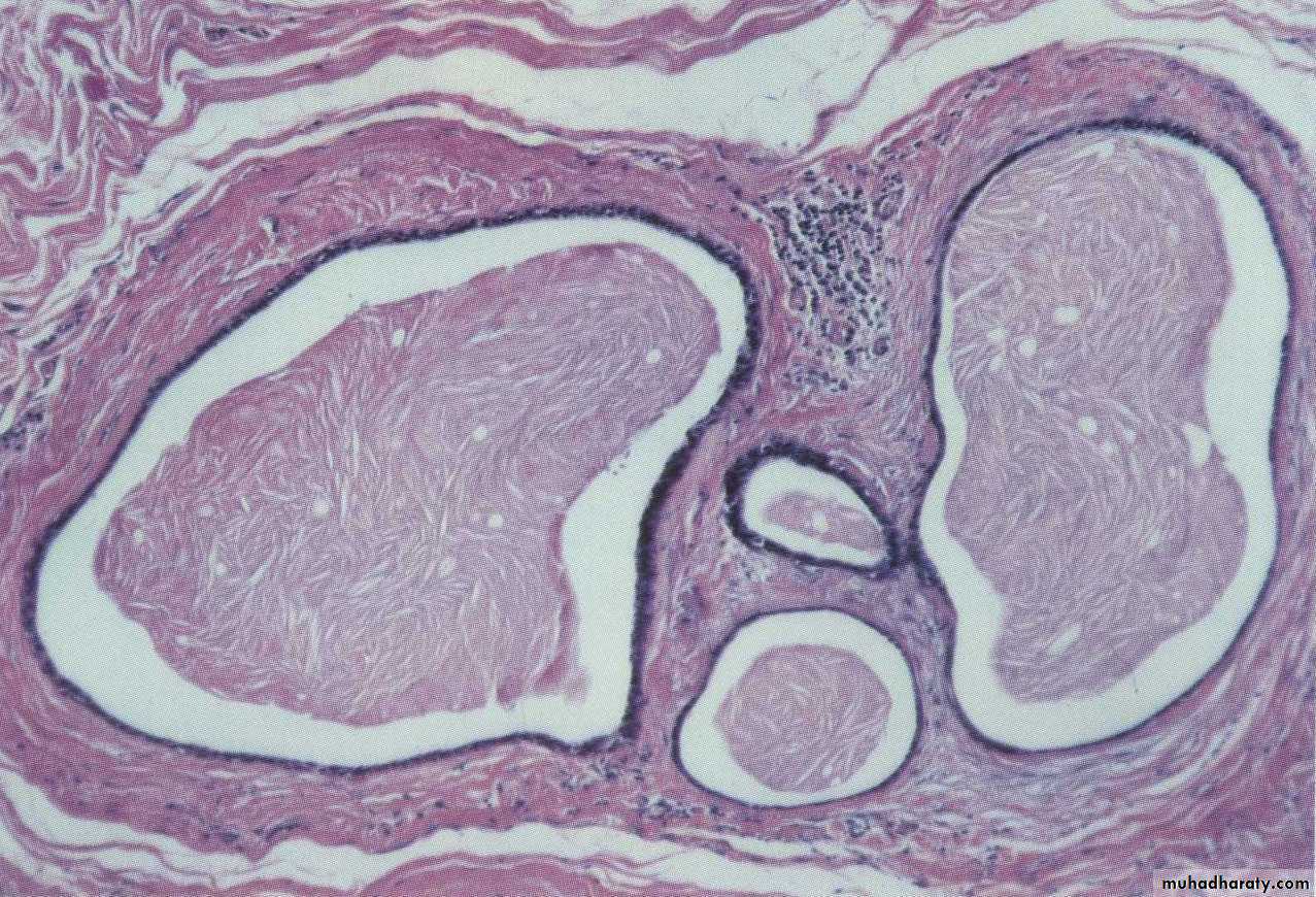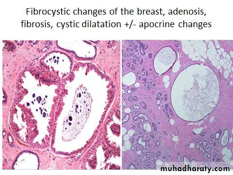 Cysts: Small cysts form by the dilation of lobules and in turn may coalesce to form larger cysts. Cysts are lined either by a flattened atrophic epithelium or by metaplastic apocrine cells(cells have abundant granular, eosinophilic cytoplasm and round nuclei basely located and closely resemble the normal apocrine epithelium of sweat glands).
