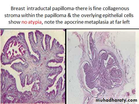 Papilloma: Papillomas grow within a dilated duct are composed of multiple branching fibrovascular cores. Epithelial hyperplasia and apocrine metaplasia are frequently present.