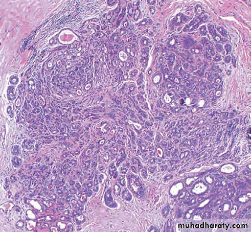 Sclerosing Adenosis. There are an increased in the fibrous stroma and an increased number of acini that are compressed and distorted in the central portion of the lesion.On occasion, stromal fibrosis may completely compress the lumens to create the appearance of solid cords or double strands of cells lying within dense stroma, a histologic pattern that at low power closely mimics invasive carcinoma