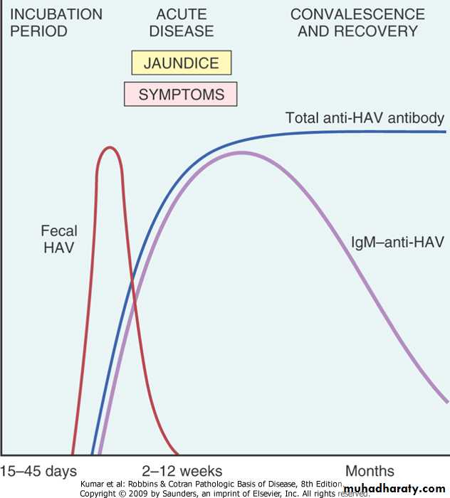 .specific anti-HAV IgM antibodies at onset of symptoms (diagnostic marker in acute infection), titer declines in months.IgG persists for years, providing protective immunity against re-infection by all strains of HAV