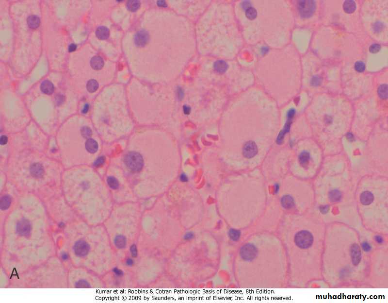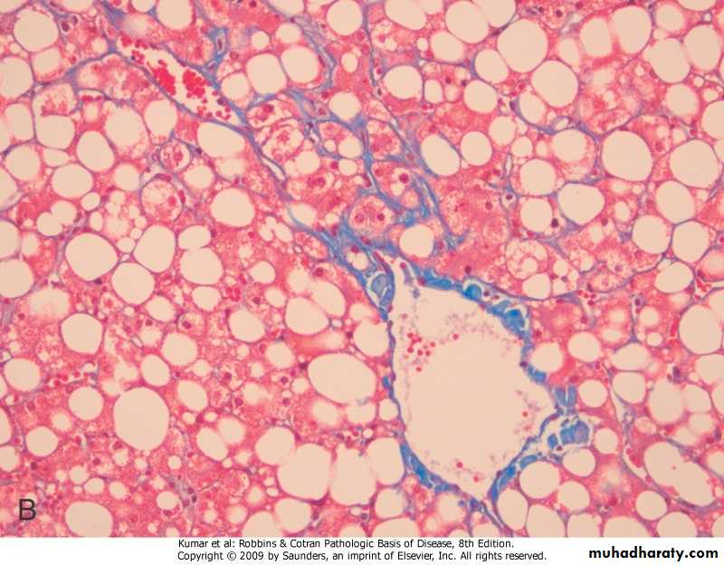 .pathogenesis -hepatocellular steatosis .increased lipid biosynthesis .defect in assembly & secretion of lipo- proteins .increased peripheral catabolism of fat -hepatitis .acetaldehyde induces disruption of cytoskeletal & membrane function .reactive oxygen species react with cellular proteins, & damage membranes .low hepatic glutathione>oxidative injury