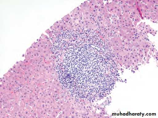 Chronic viral hepatitis due to HCV showing characteristic portaltract expansion by a lymphoid follicle.