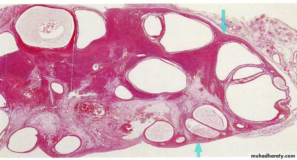 Polycystic ovary syndrome: wedge-shaped section through the ovary shows large multiple variable sized follicular cysts lined by flattened cells