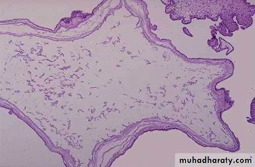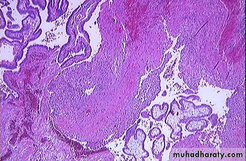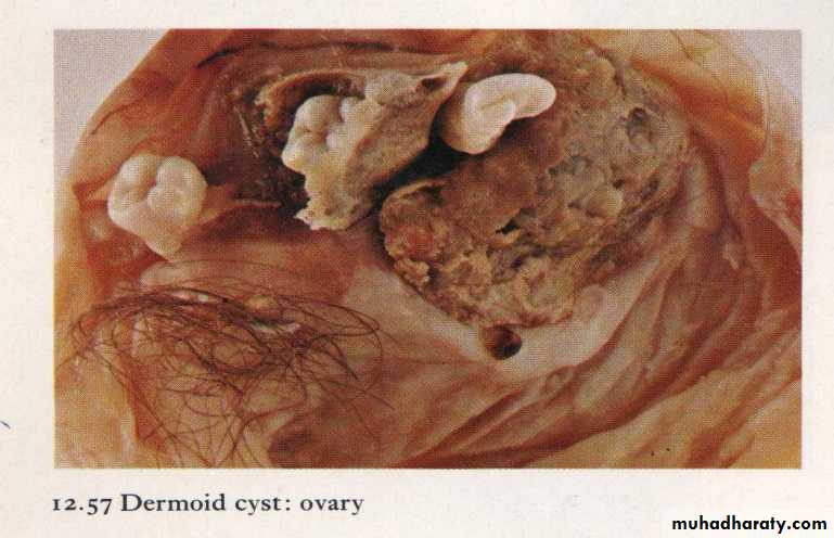 1-Mature teratoma : it is composed entirely of adult tissue derived from all 3 germ layers .Solid ,has predominantly solid gross appearance .