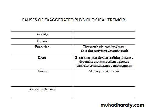 Essential tremor is distinct from a physiological tremor, although resembling it superficially. It is slower and may become quite disabling. The condition is often inherited, and in some families most obvious during certain specific actions such as writing or holding a glass. Alcohol often suppresses it, sometimes to the extent that the patient becomes depedent. Centrally acting β-adrenoceptor antagonists (β-blockers) such as propranolol are often effective in treatment.Intention tremor