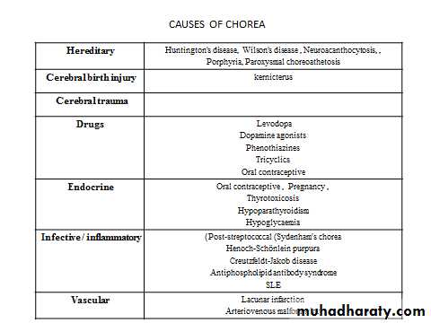 These are due to disturbance of balance of activity in the basal ganglia .Chorea (the Greek for 'dance') : Jerky, small-amplitude, purposeless involuntary movements . In the face, grimaces; they suggest disease in the caudate nucleus (as in Huntington's disease.