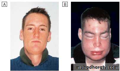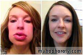 angioedema may be spontaneous or triggered by local trauma or infection. Multiple parts of the body may be involved, especially the face, extremities upper airway and gastrointestinal tract.