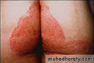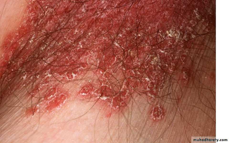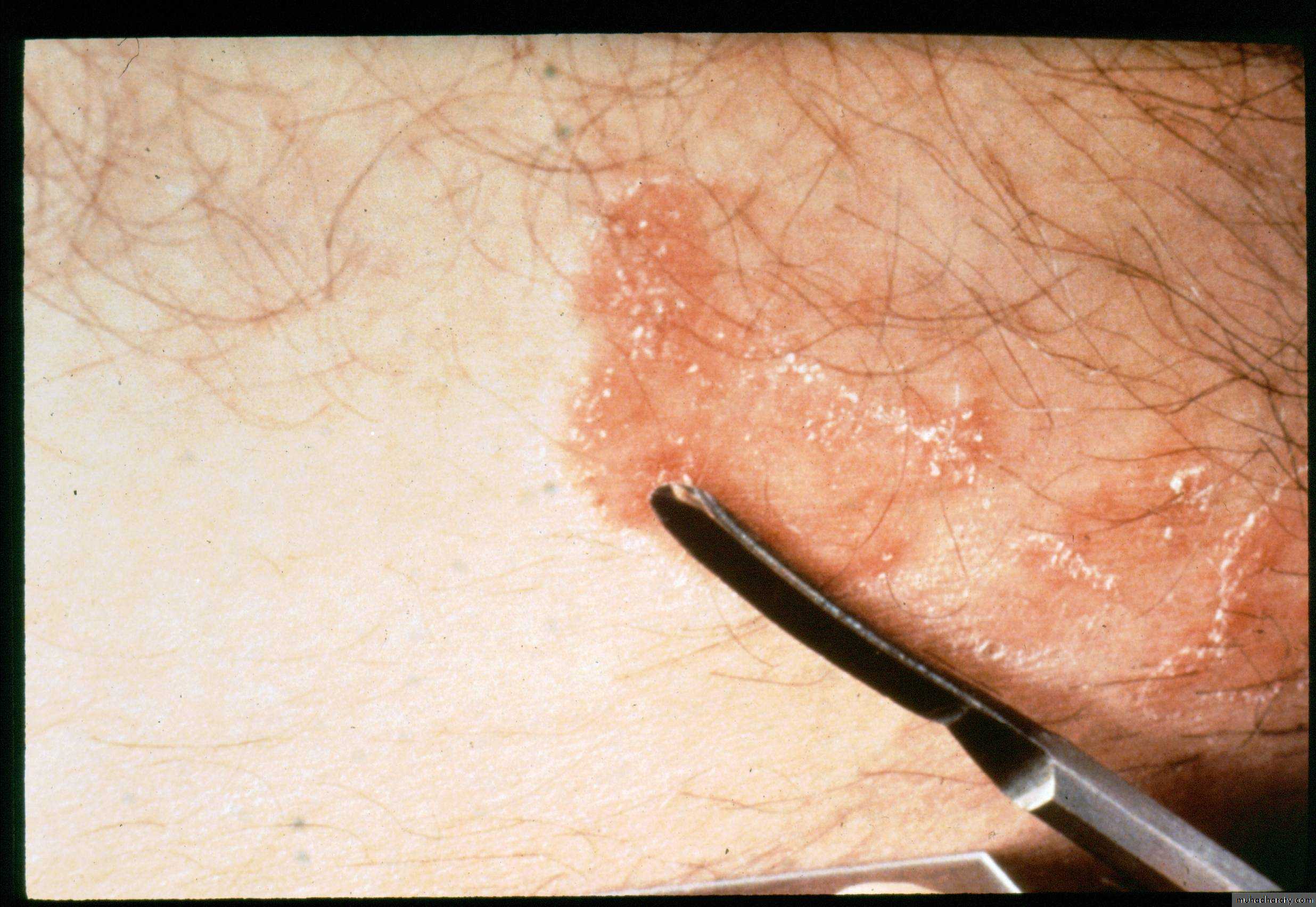 This is common and affects men more often than women. The eruption is sometimes unilateral or asymmetrical. The upper inner thigh is involved and lesions expand slowly to form sharply demarcated plaques with peripheral scaling. In contrast to candidiasis of the groin area, the scrotum is usually spread. A few vesicles or pustules may be seen within the lesions. The organisms are the same as those causing tinea pedis.