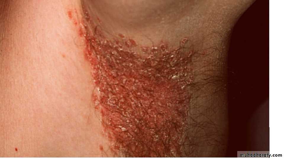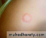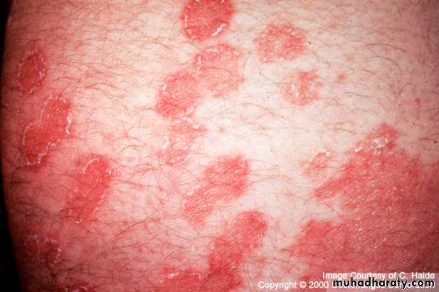 Tinea of the trunk and limbsTinea corporis is characterized by plaques with scaling and erythema most pronounced at the periphery. A few small wesicles and pustules may be seen within them. The lesions expand slowly and healing in the centre leaves a typical ring-like pattern. In some patients the fungus elicits almost no inflammation, in wich case the infection is a marginated patch of rough scaling skin.