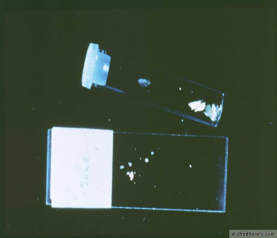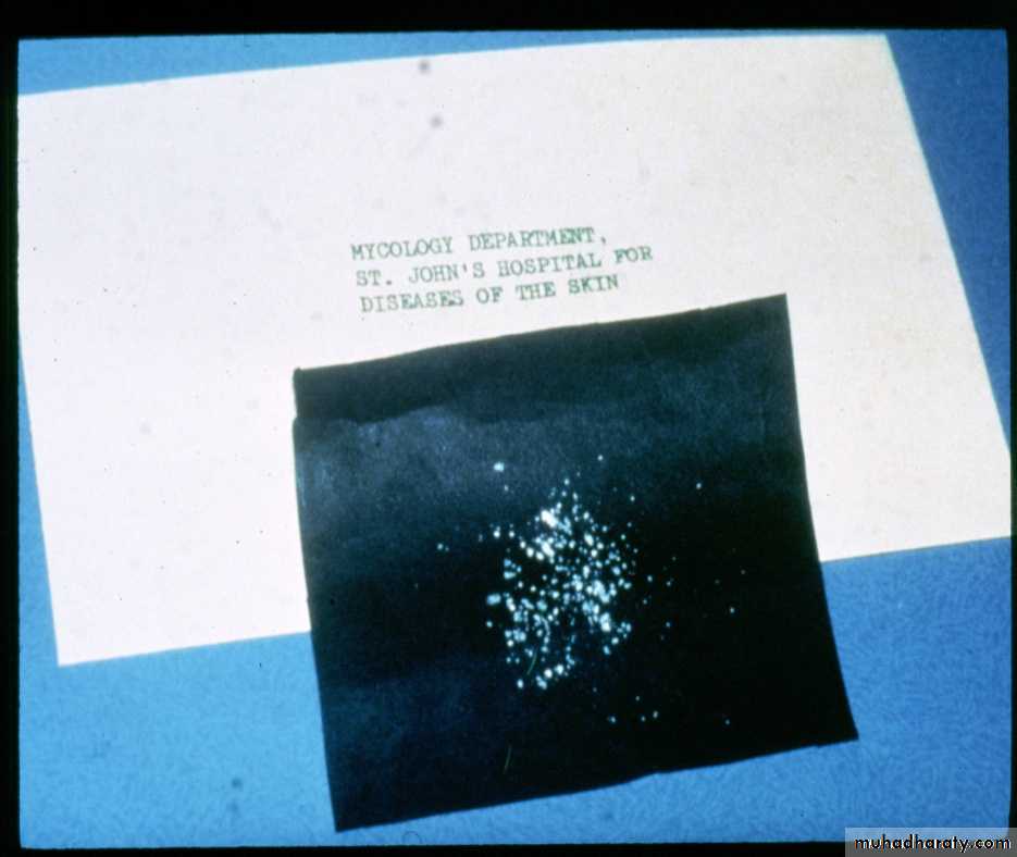 Cultures should be carried out in a mycology or bacteriology laboratory. Transport medium is not necessary, and specimens can be sent in folded black paper or a dry Petri dish. The report may take as long as a month; microscopy is much quicker.Wood's light (ultraviolet light) examination of the scalp usually reveals a green fluorescence of the hairs in Microdporum audouini and M. canis infections. The technique is useful for screening children in institutions where outbreaks of tinea capitis still sometimes occur, but the most common fungus causing tinea capitis (Trichophyton tonsurans) does not fluoresce.