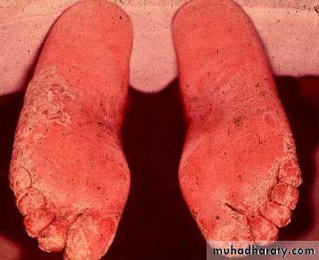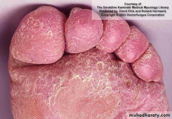 2 A diffuse dry scaling of the soles (usually T. rubrum)