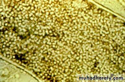 The microscopic examination of a skin scraping, nail clipping or plucked hair is a simple procedure. The scraping should be taken from the scaly margin of a lesion, with a small curette or a scalpel blade, and clippings or scrapings from the most crumbly part of a nail. Broken hairs should be plucked with tweezers. Specimens are cleared in potassium hydroxide. Branching hyphae can easily be seen using a scanning (x10) or low-power (x25) objective lens, with the iris diaphragm almost closed and the condenser racked down. Hyphae may also be seen within a cleared hair shaft, or spores may be noted around it.