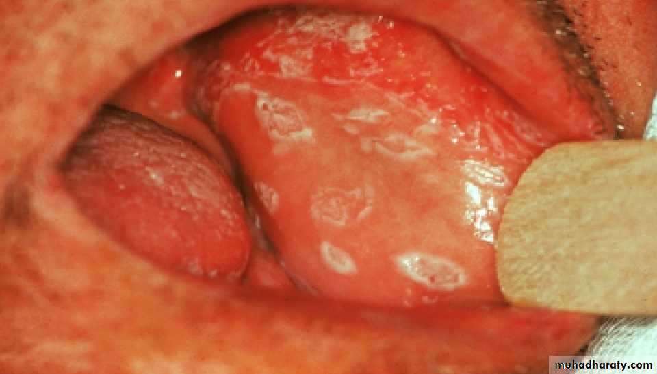 One or more whitish adherent plaques (like bread sauce) appear on the mucous membranes. If wiped off they leave an erythematous base. Under dentures, candidiasis will produce sore red areas. Angular stomatitis, usually in denture wears, may be candidal.