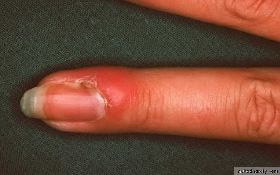 ParonychiaAcute paronychia is usually bacterial, but in chronic paronychia Candida may be the sole pathogen, or be found with other opportunists such as Proteus or Pseudomonas sp. The proximal and sometimes the lateral nail folds of one or more fingers become bolstered and red. The cuticles are lost and small amounts of pus can be expressed. The adjacent nail plate becomes ridged and discoloured. Predisposing factors include wet work, poor peripheral circulation and vulval candidiasis.