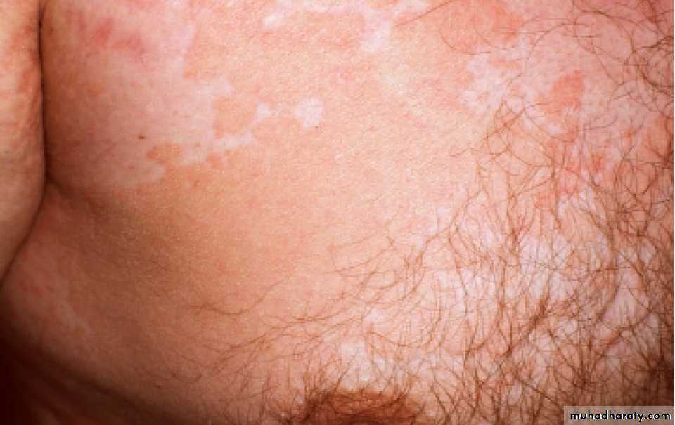 Differential diagnosisIn vitiligo, the border is clearly defined, scaling is absent, lesions are larger, the limbs and face are often affected and depigmentation is more complete; however, it may sometimes be hard to distinguish vitiligo from the pale non-scaly areas of treated versicolor. Seborrhoeic eczema of the trunk tends to be more erythematous, and is often confined to the presternal or interscapular areas. Pityriasis rosea, tinea corporis, secondary syphilis, leprosy and erythrasma seldom cause real confusion.