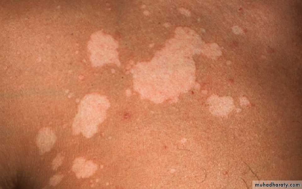 Presentation and courseThe fawn or depigmented areas, with their slightly branny scaling and fine wrinkling, look ugly. Otherwise they are symptom-free or only slightly itchy. Lesions are most common on the upper trunk but can become widespread. Untreated lesions persist, and depigmented areas – even after adequate treatment – are slow to regain their former colour. Recurrences are common.