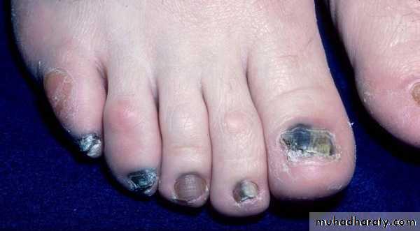 Tinea of the nailsToe nail infection is usually associated with tinea pedis. The initial changes occur at the free edge of the nail, which becomes yellow and crumbly. Subungual hyperkeratosisi, separation of the nail from its bed and thickening may then follow. Usually, only a few nails are infected but rarely all are. Finger nail lesions are similar, but less common, and are seldom seen without a chronic T. rubrum infection of the skin of the same hand.