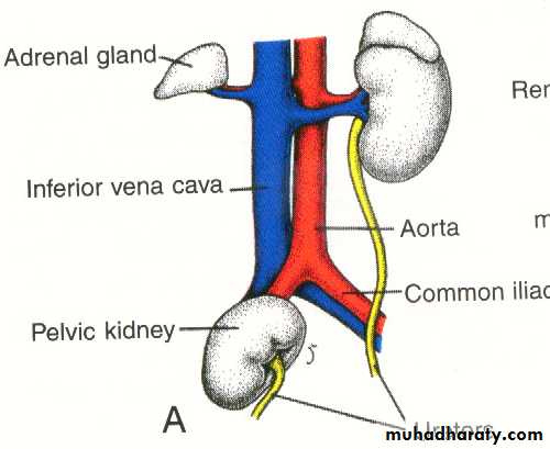 • Pelvic kidney: due to failure of the kidney to ascend, it remains in the pelvis close to the common iliac artery.