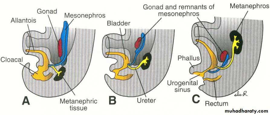 The mesoderm at the angle between the allantois and the cloaca proliferates to form the urorectal septum which descends towards the cloacal membrane, thus dividing the cloaca into 2 parts: