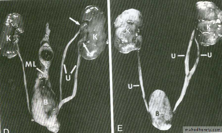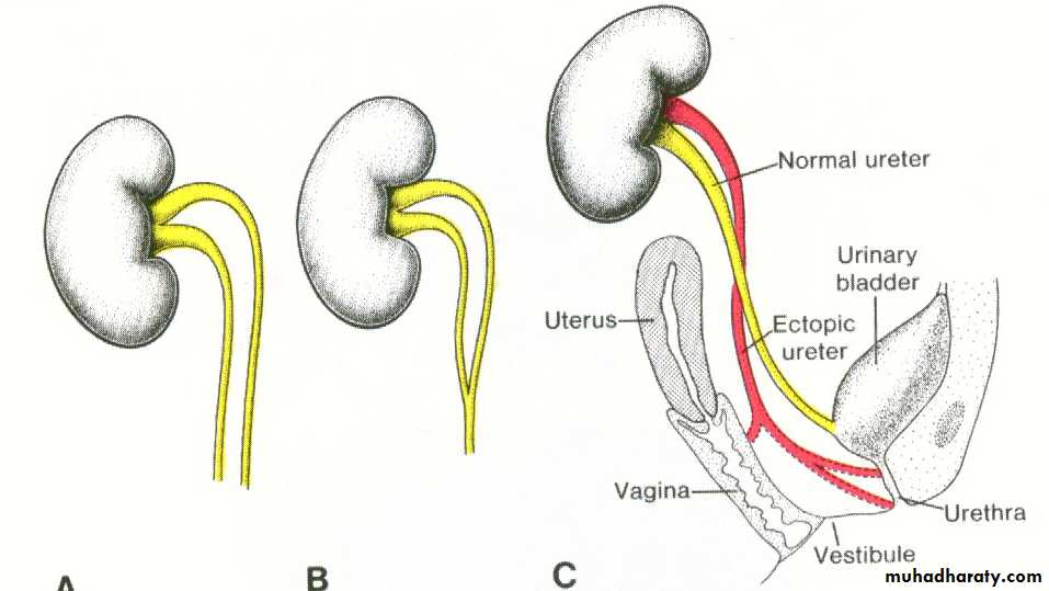 Double ureter: complete or partial duplication, 2 uretric buds develop from the mesonephric duct.Bifid ureter or cleft pelvis of the ureter.