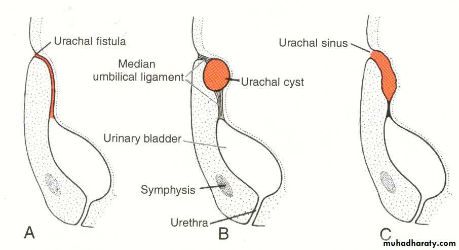 Ectopic Vesicae: opening of the bladder cavity onto the surface just above the symphysys pubis due to failure of formation of the anterior wall of the bladder.Persistence of a patent urachus: lumen of the allantois persist.