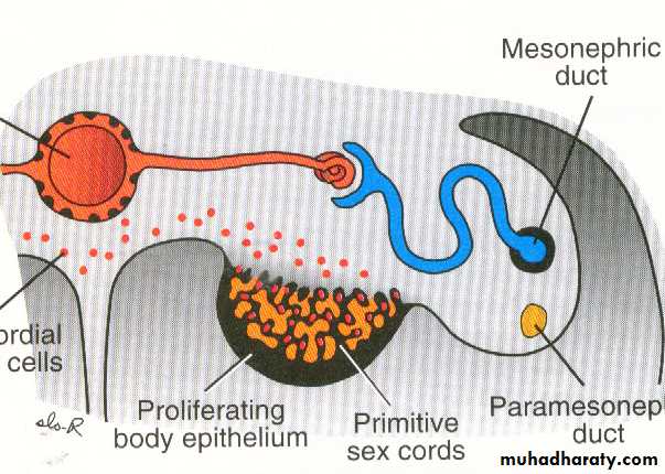 • The gonads appear as a pair of longitudinal ridge called genital ridge.• The primordial germ cells appear in the wall of yolk sac and migrate to reach the gonads at 5th week and invade the epithelium of the genital ridge which proliferate to form primitive sex cords.