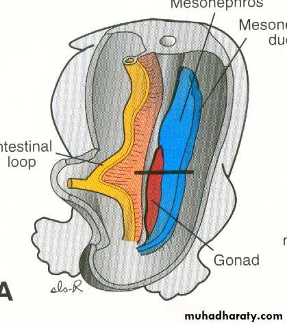 The mesonephros forms a mass which bulge into the coelomic cavity as an ovoid mass on each side of midline +developing gonads forming a ridge called urogenital ridge.