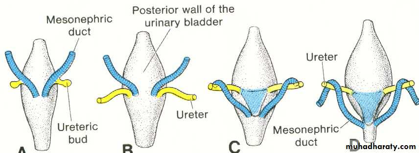 • The lower end of the duct gives the ureteric bud.• The part caudal to the uretric bud is absorbed into the urogenital sinus to form posterior part of the bladder wall (trigon) and upper post. wall of prostatic urethra.