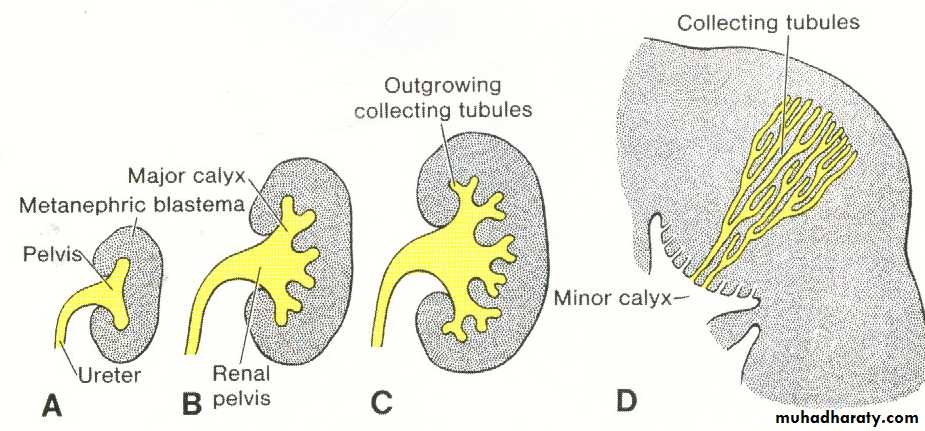 • The cranial end of the uretric bud divides repeatedly to form the major and minor calyces as well as the collecting tubules of the kidney(1-3 milion). The successive generations of the tubules elongated and converge on the minor calyx forming (renal pyramid).