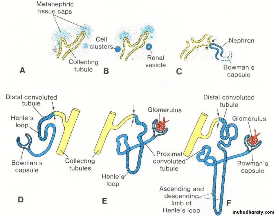 Each collecting tubule become covered by a separate small mass of mesoderm of the metanephric cap, this solid small mass is canalized and become S-shaped tubule called metanephric tubule which elongates and become much convoluted with 2 ends one open into the collecting tubule while the other end expanded and invaginated by a tuft of capillaries to form the renal corpuscle thus forming the nephrons of the kidney.The kidney is lobulated at first later on, the lobulation will disappear during 1st year after birth.