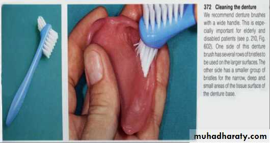 Oral Hygiene and Denture StomatitisDenture stomatitis is a commonly recurring problem of denture wearers. It is characterized by erythema and found under complete or partial denture but more frequently in the maxilla .The elderly patients should be carefully instructed on how to perform a good oral and denture hygiene through explanation and physical demonstration of how to remove the denture plaque.Edentate adults must employ oral hygiene procedure after each meal with denture cleansers and brushes to decrease the likelihood of developing oral mucosal disease and fungal infections.
