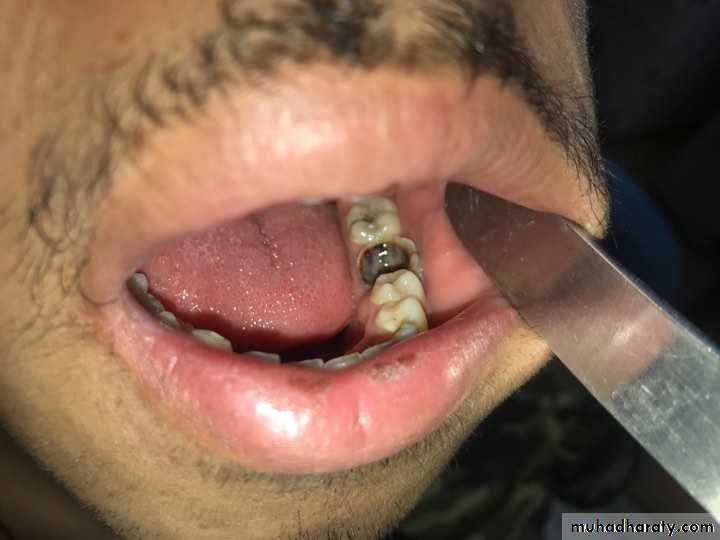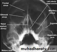 Infection from upper molars and less frequently premolars may spread to the maxillary antrum, this depends on the size of the maxillary antrum and the length of the root.It causes acute sinusitis with facial pain that worsens on bending or leaning forward, the infection may lead a chronic course leading to mucosal thickening and polyps. Occipito-mental radiograph shows opaque maxillary sinus or fluid level.