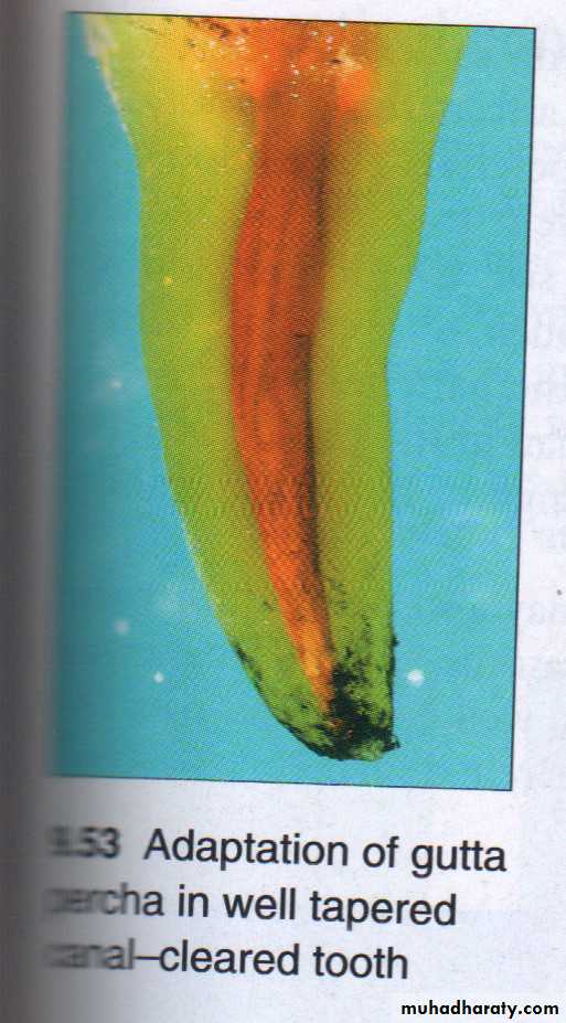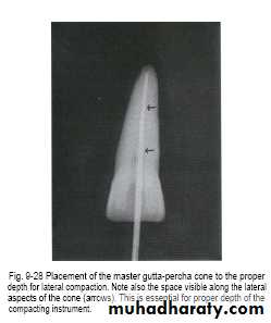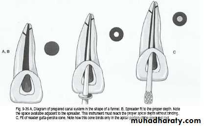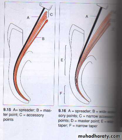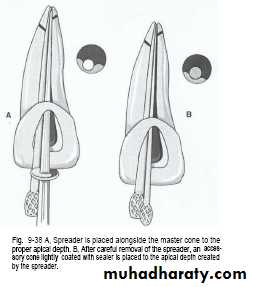 • The spreader should penetrate the apical 1\3 (a rubber stopper should be placed to mark the length of penetration 2-3mm. from the tip of the master cone)