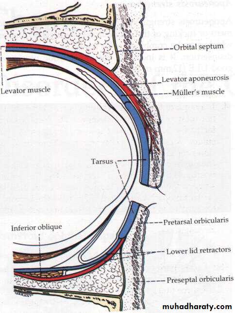 Muller’s muscle : a thin smooth muscle, supplied by sympathetic nerve, contributes in elevation of the upper lid. Interruption of nerve supply to this muscle cause mild ptosis (Horner syndrome).