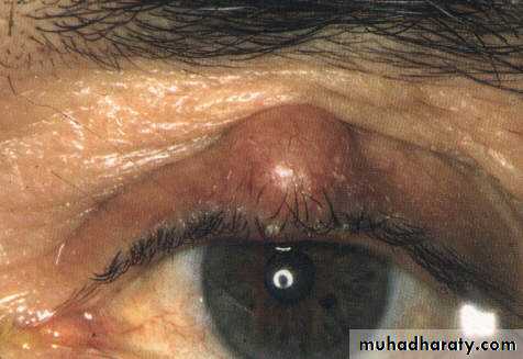Acute Staphylococcus infection of a meibomian glandClinical features; tender hyperemic, swelling within the lid .