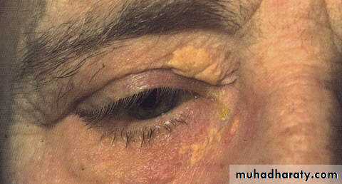 BenignXanthelasma; yellowish slightly elevated plaque of lipid deposits