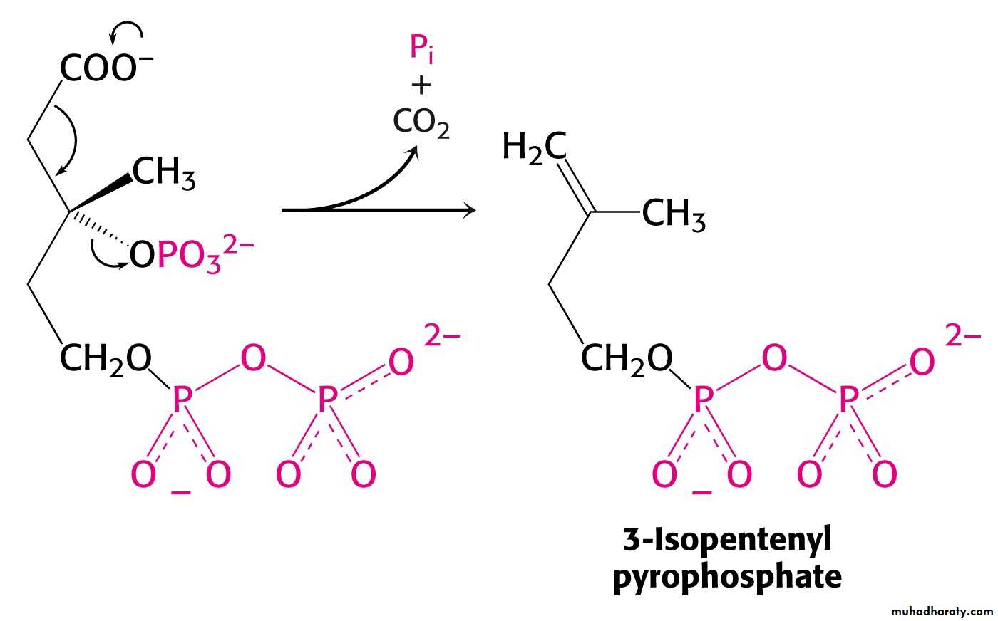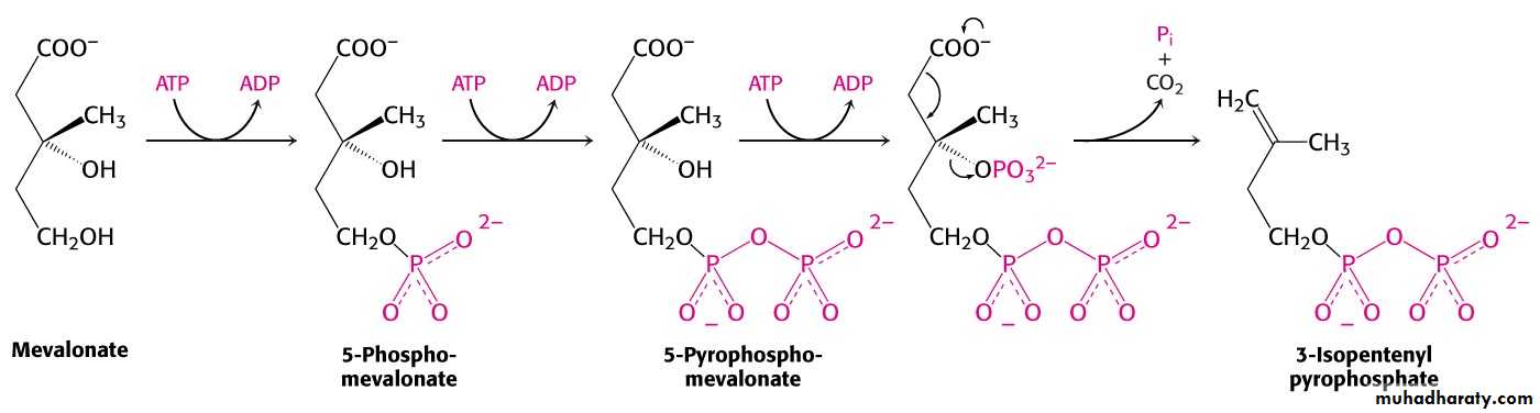 Mevalonate is converted into 3-isopentenyl pyrophosphate in three consecutive reactions requiring ATP and decarboxylation.