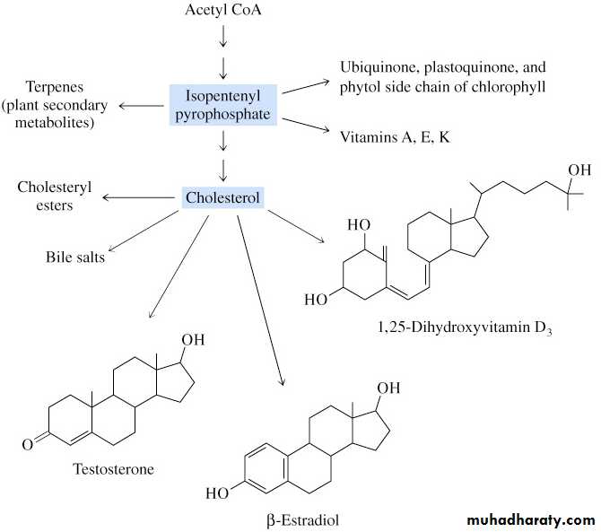 1. Synthesis of isopentenyl pyrophosphate, that is the key building block of cholesterol, from acetyl CoA