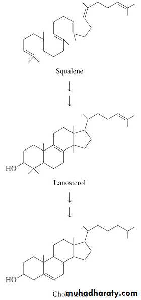 3. Squalene cyclizes and the tetracyclic product is converted into cholesterol