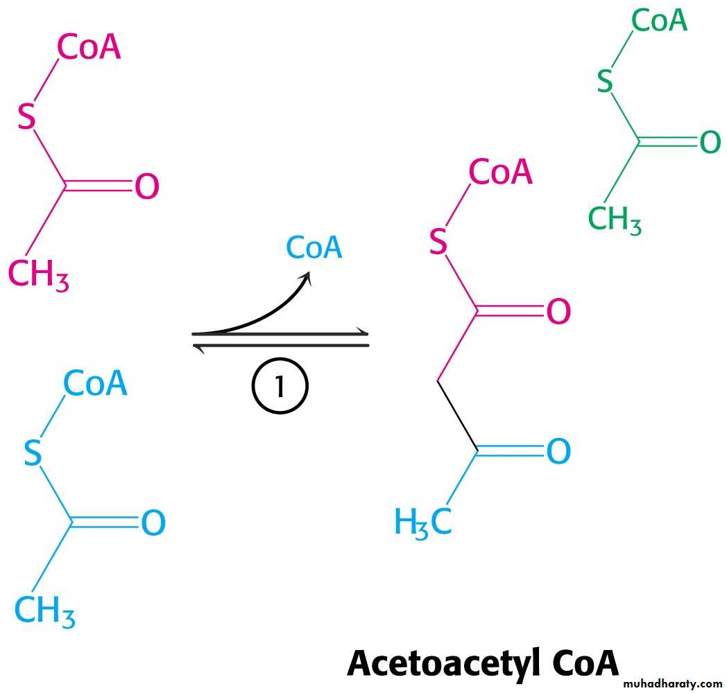 • Sequential condensation of three molecules of acetyl CoATwo molecules of acetyl CoA condense to form acetoacetyl CoA.